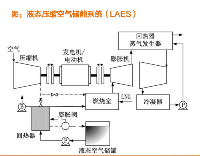 液態(tài)壓縮空氣儲(chǔ)能系統(tǒng)(LAES):借助于空氣降溫液化技術(shù),通過添加流程使空氣以液態(tài)形式儲(chǔ)存。儲(chǔ)能時(shí),經(jīng)過壓縮機(jī)的高壓空氣進(jìn)入回?zé)崞鹘禍睾徒祲涸O(shè)備進(jìn)行液化,被液化的常壓低溫液態(tài)空氣儲(chǔ)存在儲(chǔ)液罐中;釋能時(shí),液態(tài)空氣經(jīng)過低溫泵升壓、回?zé)崞魃郎?,然后進(jìn)入燃燒室,與燃料混合燃燒后進(jìn)入膨脹機(jī)膨脹做功。
