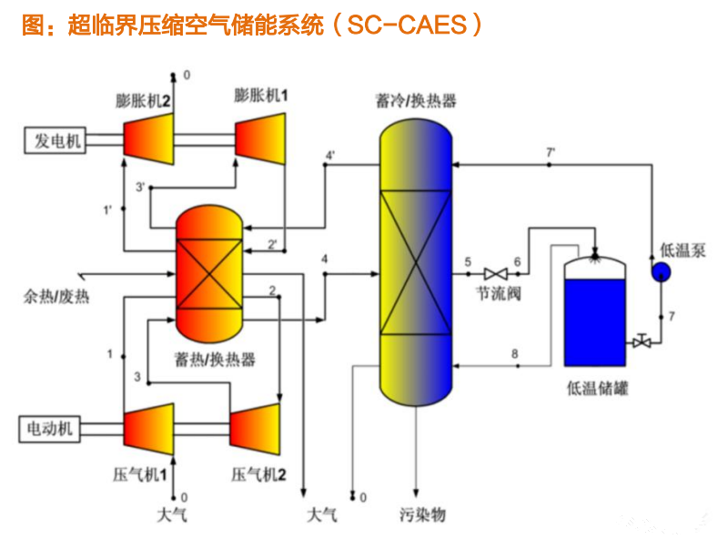 超臨界壓縮空氣儲(chǔ)能系統(tǒng)(SC-CAES):利用空氣的超臨界特性,在蓄熱/冷過程中高效傳熱/冷,并將空氣以液態(tài)形式儲(chǔ)存,實(shí)現(xiàn)系統(tǒng)高效和高能量密度的優(yōu)點(diǎn),系統(tǒng)兼具蓄熱式和液態(tài)壓縮空氣儲(chǔ)能的特點(diǎn),同時(shí)擺脫了依賴大型儲(chǔ)氣室和化石燃料的問題。