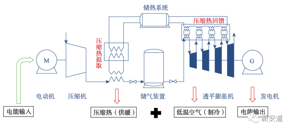 蓄熱式壓縮空氣儲(chǔ)能(TS-CAES):空氣壓縮過程會(huì)產(chǎn)生壓縮熱,在傳統(tǒng)壓縮空氣儲(chǔ)能中,這部分熱量通常被冷卻水帶走,最終耗散掉,而蓄熱式壓縮空氣儲(chǔ)能則將這部分熱量在儲(chǔ)能時(shí)儲(chǔ)存起來,而在釋能時(shí)用這部分熱量加熱膨脹機(jī)入口空氣,實(shí)現(xiàn)能量的回收利用,提高了系統(tǒng)效率。同時(shí)由于膨脹機(jī)前有壓縮熱的加熱,可以取消燃燒室,即該系統(tǒng)也擺脫了對(duì)化石燃料的依賴。