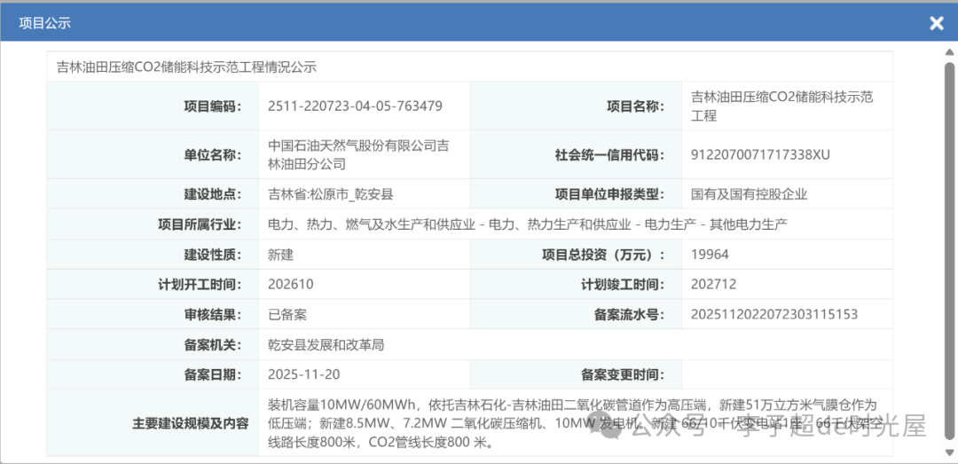 11月20日,據(jù)吉林投資監(jiān)管平臺(tái)披露:吉林油田壓縮CO2儲(chǔ)能科技示范工程申請(qǐng)備案乾安縣發(fā)展和改革局2025-11-20審批通過項(xiàng)目代碼:2511-220723-04-05-763479項(xiàng)目規(guī)模:10MW/60MWh單位名稱:中國(guó)石油天然氣股份有限公司吉林油田分公司項(xiàng)目總投資:19964萬(wàn)元