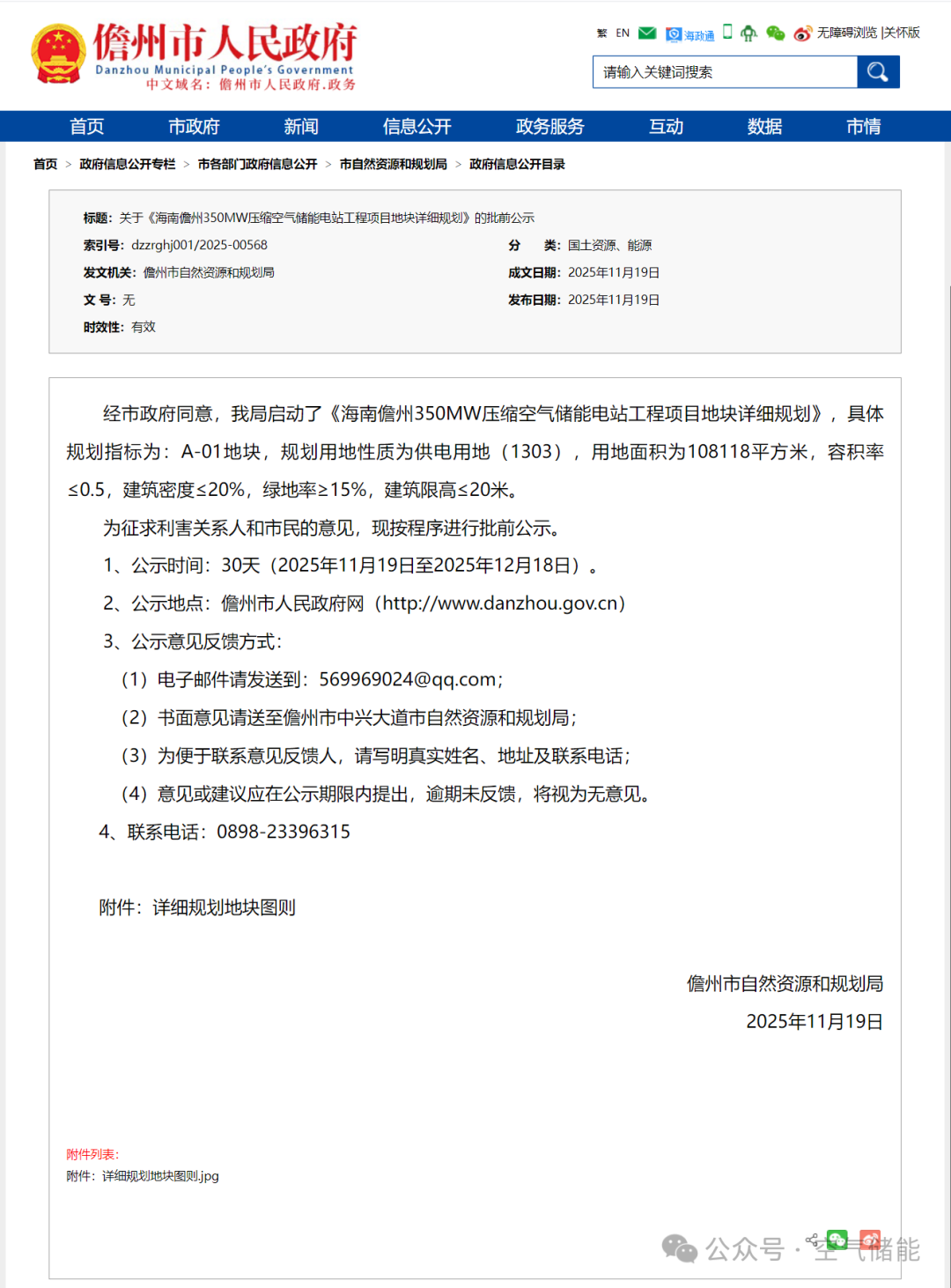 11月19日,儋州市人民政府網(wǎng)站發(fā)布關(guān)于《海南儋州350MW壓縮空氣儲(chǔ)能電站工程項(xiàng)目地塊詳細(xì)規(guī)劃》的批前公示,詳情如下: