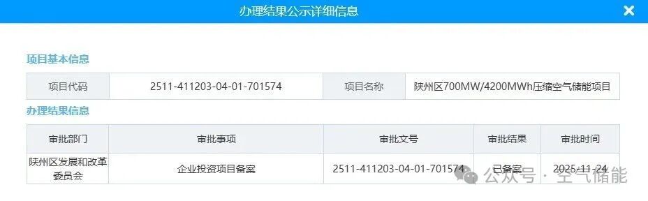 11月24日,據(jù)投資項(xiàng)目監(jiān)管平臺(tái)披露:陜州區(qū)700MW/4200MWh壓縮空氣儲(chǔ)能項(xiàng)目申請(qǐng)備案陜州區(qū)發(fā)展和改革委員會(huì)2025-11-24審批通過(guò)項(xiàng)目代碼:2511-411203-04-01-701574