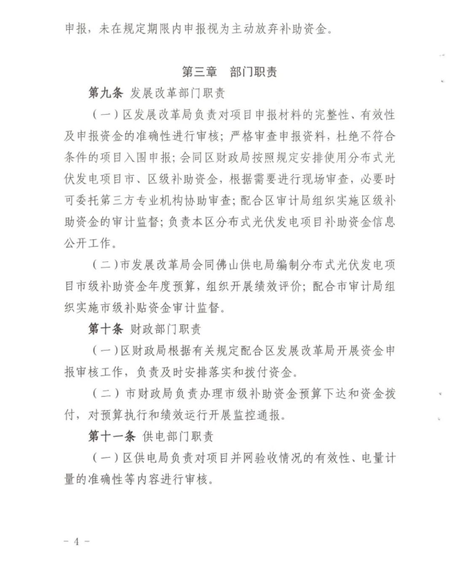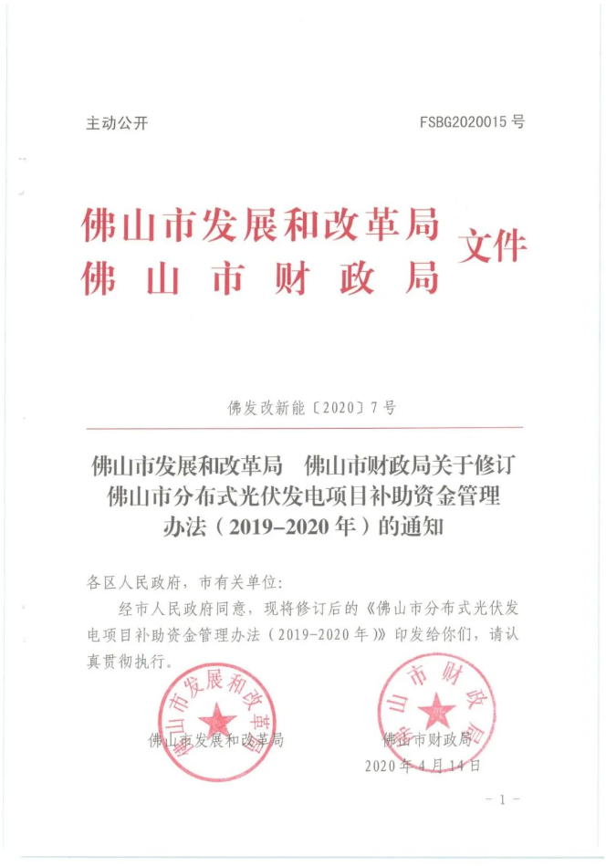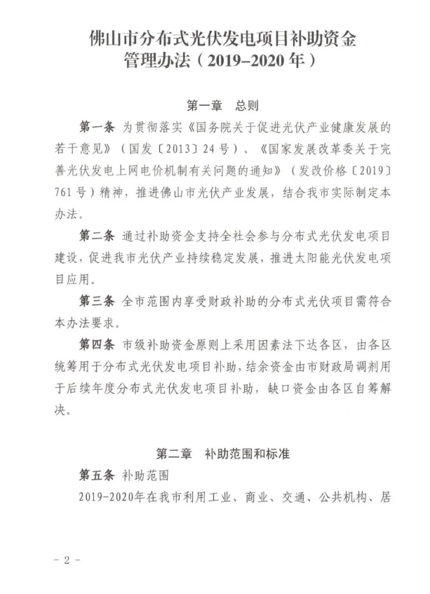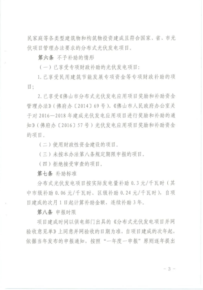 通知明確,對(duì)2019—2020年在禪城區(qū)利用工業(yè)、商業(yè)、交通、公共機(jī)構(gòu)、居民家庭等各類型建筑物和構(gòu)筑物建成且符合國(guó)家、省、市光伏項(xiàng)目管理辦法要求的分布式光伏發(fā)電項(xiàng)目按實(shí)際發(fā)電量補(bǔ)助0.3元/千瓦時(shí)(其中市級(jí)補(bǔ)助0.06元/千瓦時(shí)、區(qū)級(jí)補(bǔ)助0.24元/千瓦時(shí)),自項(xiàng)目建成的次月1日起計(jì)算補(bǔ)助金額,連續(xù)補(bǔ)助3年。(項(xiàng)目建成時(shí)間按供電部門出具的《并網(wǎng)驗(yàn)收意見單》上并網(wǎng)驗(yàn)收時(shí)間為準(zhǔn))