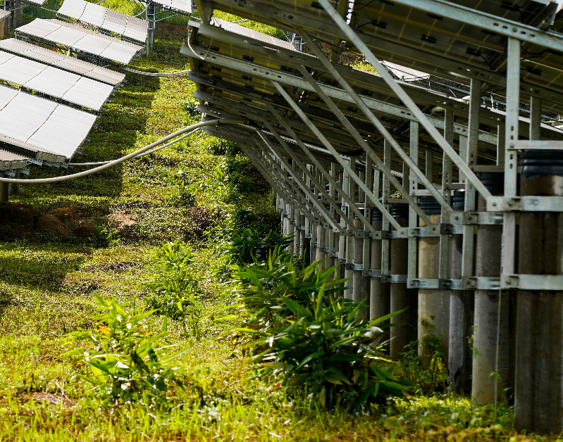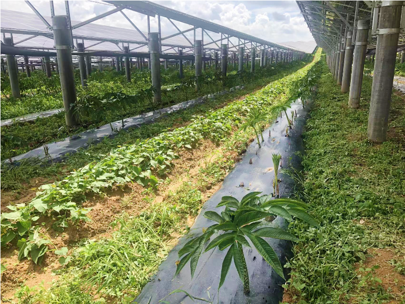 在揭陽市惠來縣,廣東能源葵潭農(nóng)場光伏復(fù)合項目日照充足,為光伏產(chǎn)業(yè)的發(fā)展提供了極佳的自然條件。魔芋作為一種喜陰怕曬,喜涼怕熱作物,該項目場址屬亞熱帶氣候,光伏板恰好為魔芋的生長起到恰到好處的“庇護”作用,有效促進(jìn)“農(nóng)”與“光”的有機結(jié)合,實現(xiàn)了同一片土地上的產(chǎn)業(yè)融合發(fā)展和土地立體化增值利用。
