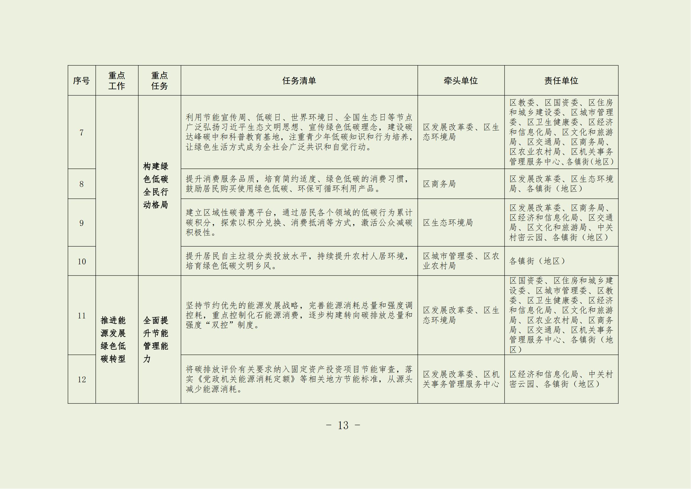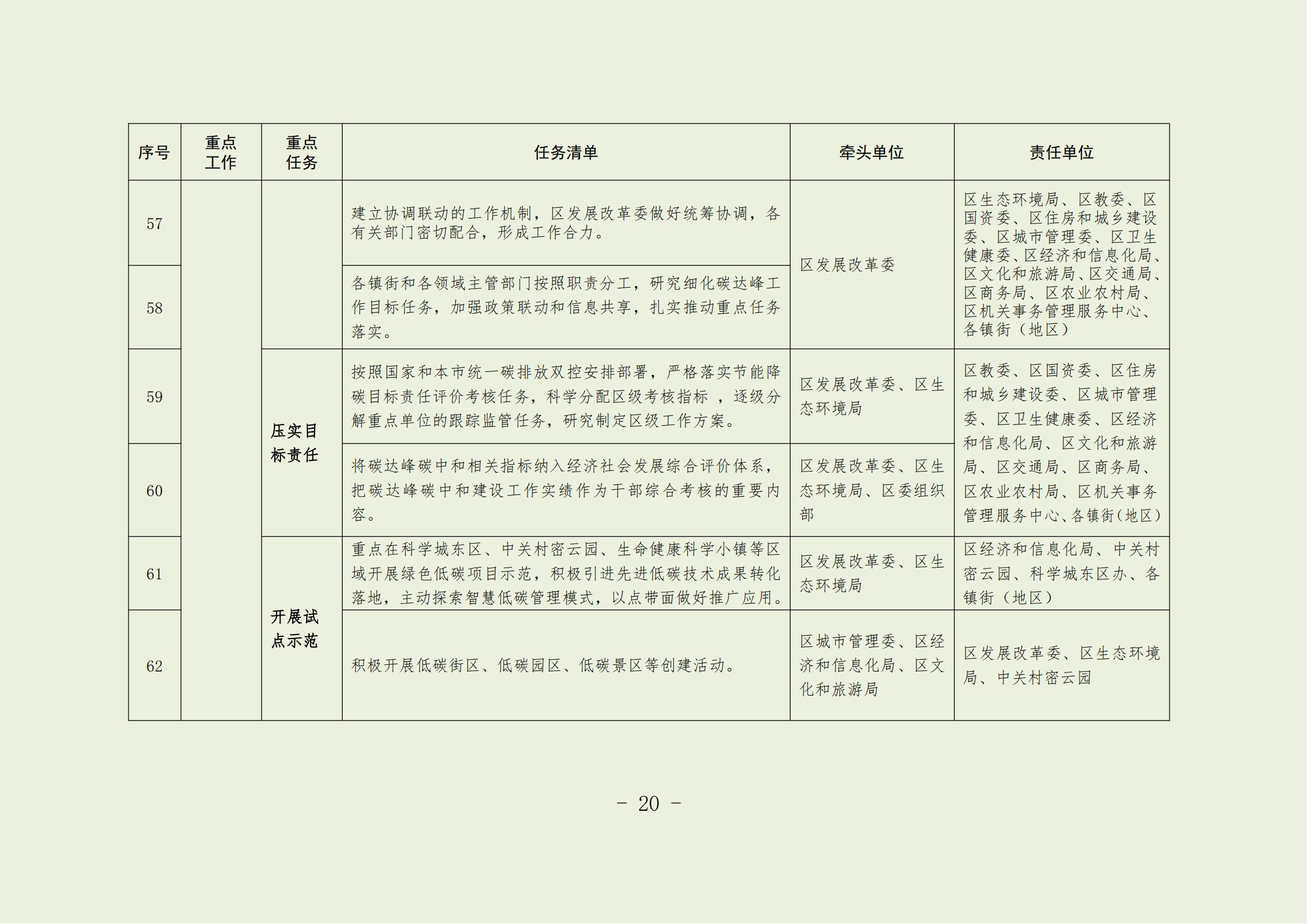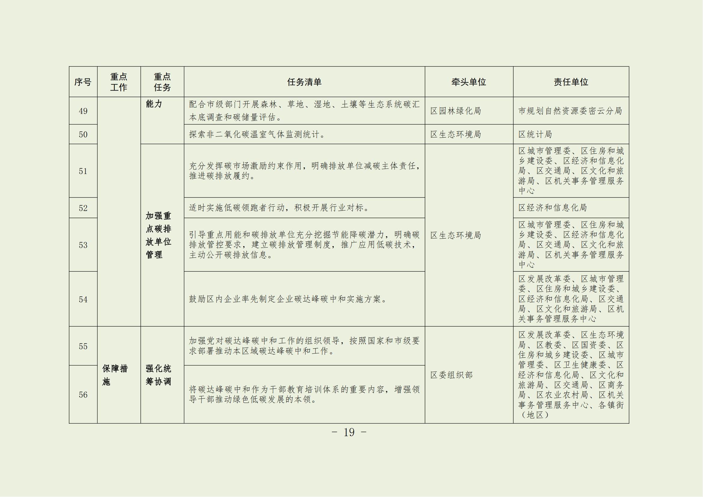 18.壓實目標責(zé)任。按照國家和本市碳排放雙控安排部署,嚴格落實節(jié)能降碳目標責(zé)任評價考核任務(wù),科學(xué)分配區(qū)級考核指標,逐級分解重點單位的跟蹤監(jiān)管任務(wù),研究制定區(qū)級工作方案。將碳達峰碳中和相關(guān)指標納入經(jīng)濟社會發(fā)展綜合評價體系,把碳達峰碳中和建設(shè)工作實績作為干部綜合考核的重要內(nèi)容。